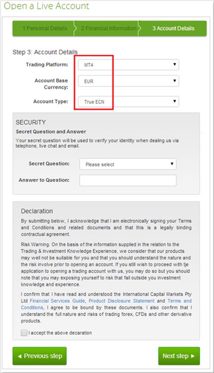 - Detalles de la Cuenta de Trading. Rellena los campos como aparecen en la figura. Elige y responde a tu pregunta secreta. Lee y acepta la declaracion.
